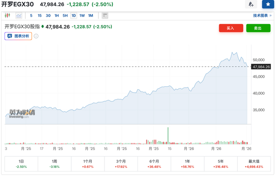 埃及證交所EGX 30指數收跌2.50%,報47984.26點,跳空低開之后,跌幅迅速一度擴大至將近5.84%,刷新日低。