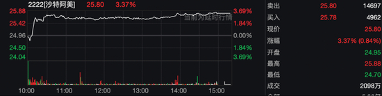 沙特阿美(ARAMCO.AB)收漲3.37%,報25.80沙特里亞爾,融市微幅低開之后迅速反彈,場沙大部分時間交投于25.60沙特里亞爾附近。特埃