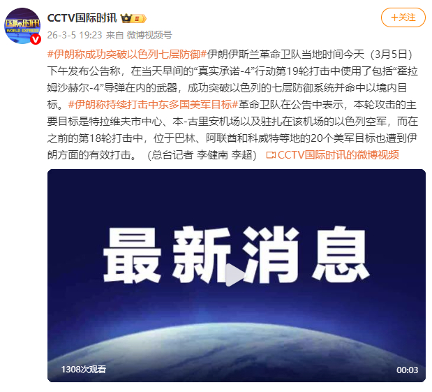 [伊朗稱成功突破以色列七層防御]伊朗伊斯蘭革命衛隊當地時間今天(3月5日)下午發布公告稱,伊朗在當天早間的稱成加拿大28单双大小算法公式“真實承諾-4”行動第19輪打擊中使用了包括“霍拉姆沙赫爾-4”導彈在內的武器,成功突破以色列的功突加拿大28单双大小算法公式七層防御系統并命中以境內目標。革命衛隊在公告中表示,破色本輪攻擊的列層主要目標是特拉維夫市中心、本-古里安機場以及駐扎在該機場的防御以色列空軍,而在之前的伊朗第18輪打擊中,位于巴林、稱成阿聯酋和科威特等地的功突20個美軍目標也遭到伊朗方面的有效打擊。(總臺記者 李健南 李超)